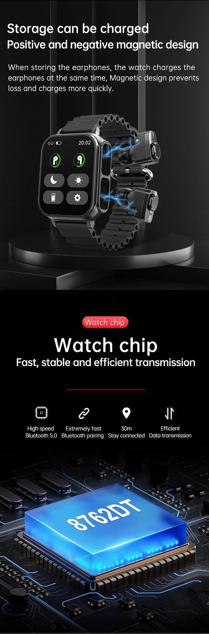 Entertainment,incoming call,clock display, smart watch earbuds 2 in 1